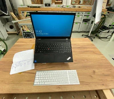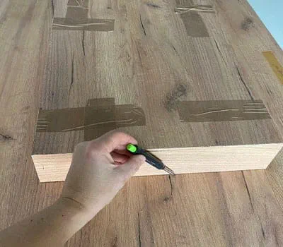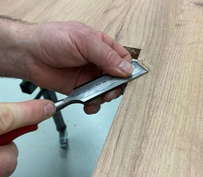 No nosso caso, trabalhamos com um tampo de mesa folheado. Este tem de ser fixado à mesa de trabalho numa posição elevada, de modo a não o cortarmos (ver imagem).