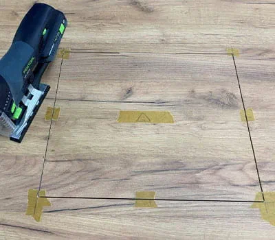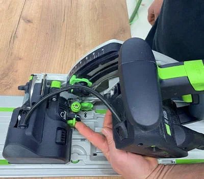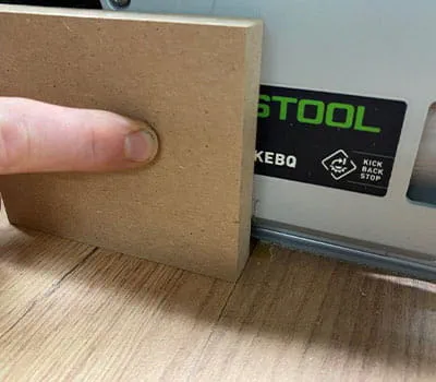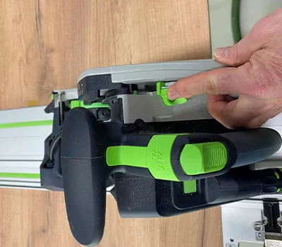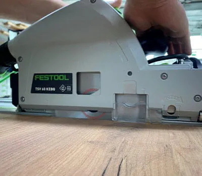 Tal como no disco de serra principal, o disco de pré-corte tem umas marcas no corpo da serra para dar uma orientação da saída inicial e final do disco. Coloque a serra de forma a que a marcação fique nivelada com a marcação na sua mesa (ver foto) e faça agora o primeiro dos 4 pré-cortes com a serra. Faça-o à vista e utilize novamente a marca do móvel como guia. Segue-se diretamente o corte com o disco de corte principal. Para isso, desativamos novamente a função de pré-corte e desbloqueamos o disco de corte principal.