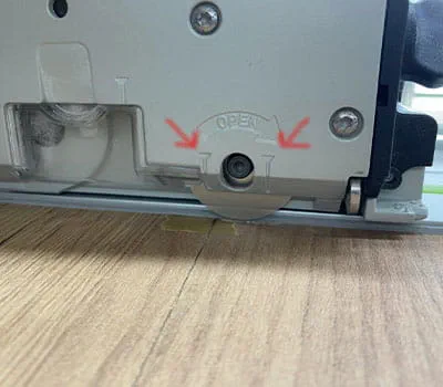 Para cortar uma superfície interior, são necessários dois passos para obter um resultado de corte perfeito até aos cantos. Isto significa que, primeiro, fazemos uma pré-marcação e, no segundo passo, cortamos novamente com o disco de corte principal. Para isso, primeiro ativamos o disco com função de pré-corte com a alavanca frontal colocada em "ON". O marcador está agora ativado.