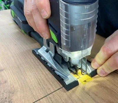 Agora, os cantos têm de ser cortados até ao fim. Para evitar estilhar, certifique-se de que não utiliza uma uma lâmina tico-tico mais larga do que o disco da serra circular. Preste atenção aos ajustes da serra. Coloque a proteção contra estilhaços e desligue o curso do pêndulo.