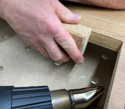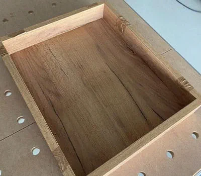 Neste caso, é importante orlar sempre os dois lados opostos e depois fresar ambos os lados, para que a fita da orla não fique presa em lado nenhum. Dependendo da espessura da orla, a aba pode ter de ser aparada um pouco antes. Uma pequena dica: a orla da frente da aba pode ser ligeiramente cortada para facilitar a abertura e o fecho. (Passo não necessário com multiplex)