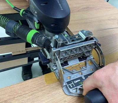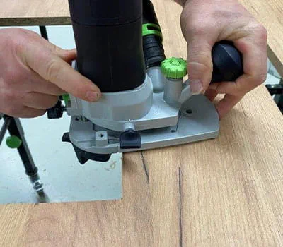 No nosso caso, a fresa de 12 mm para a fresadora de buchas serve perfeitamente. Em alternativa, também pode utilizar uma tupia para cortar os orifícios para as dobradiças.