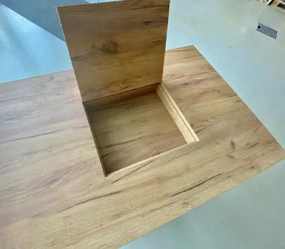Viramos o tampo da mesa (com a parte de baixo para cima) e transportamos a caixa para a nossa abertura. Agora, ligamos as partes com cola ou cavilha e fixamo-las até a cola secar.