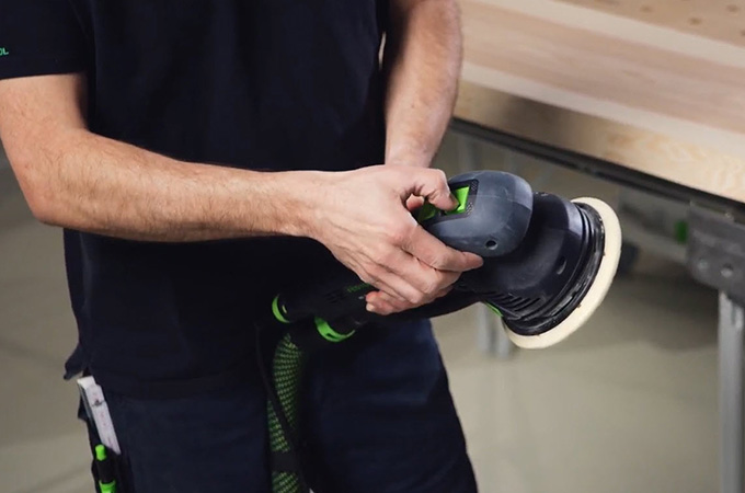 Durante a lixagem fina, as marcas de lixagem resultantes devem ser lixadas de modo a deixarem de ser visíveis após o tratamento de superfície. Para o efeito, a granalha P120 é inicialmente deixada na máquina. O ROTEX é comutado para o movimento excêntrico (lixagem fina). As marcas de lixagem da lixagem grossa são então removidas. Também aqui, o trabalho é efectuado em movimento cruzado.