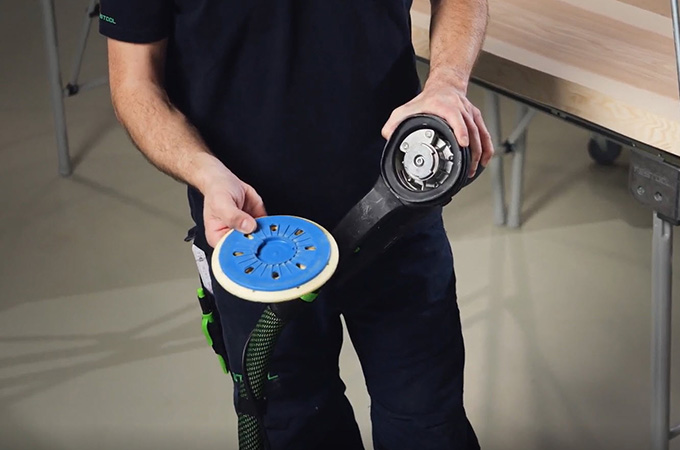 Pode substituir o disco do ROTEX muito rapidamente através da interface FastFix. Para o efeito, desligue primeiro a ficha de rede e, em seguida, coloque o comutador na posição de lixagem grossa. O batente do veio é então acionado. O disco é então rodado no sentido contrário ao dos ponteiros do relógio sem ferramentas.