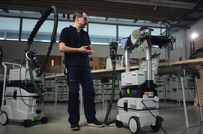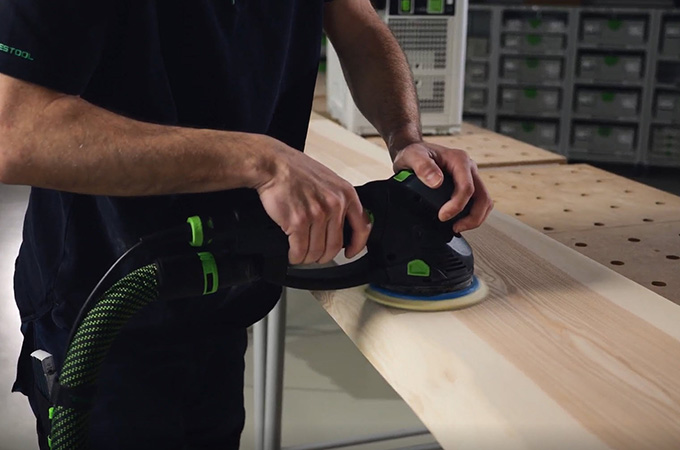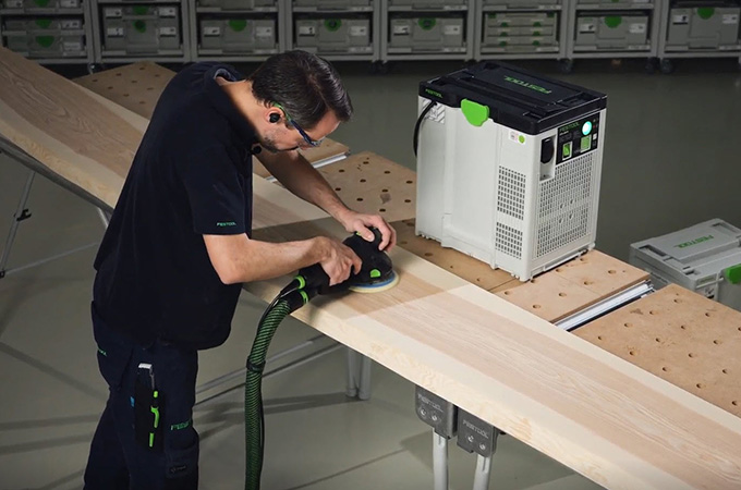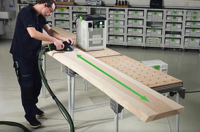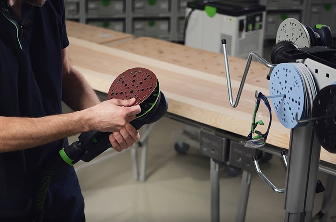 As superfícies de madeira aplainada têm as chamadas marcas de faca, também conhecidas como marcas de aplainar, causadas pelas Lâminas de aplainar. Estas devem ser lixadas antes do revestimento de superfície. Isto resulta numa superfície mais lisa e mais homogénea e também dá ao revestimento de superfície uma melhor aderência ou uma melhor penetração na madeira. Se não dispuser de uma máquina de lixar estacionária de grandes dimensões, pode efetuar este passo de trabalho com lixadeiras manuais. A ROTEX é ideal para isso porque combina a lixagem grossa e a lixagem orbital aleatória numa só máquina. Uma vez que este trabalho é efectuado principalmente na oficina, é vantajoso configurar o local de trabalho em conformidade. Por isso, gostaríamos de falar brevemente sobre os acessórios do nosso sistema.