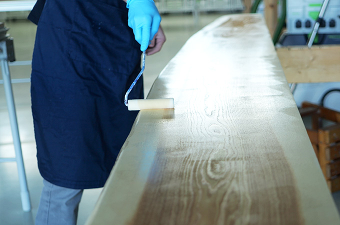 Para madeiras como o carvalho, faz sentido regar a superfície antes da lixagem final. Para isso, humedeça a superfície com uma esponja ou um pano húmido. As fibras da madeira levantam-se e podem ser niveladas com uma última lixagem fina após a secagem. Durante a lixagem intermédia após o primeiro revestimento de superfície, estas fibras já estão cortadas e a superfície fica ainda mais lisa. A imersão é também uma grande vantagem quando se trabalha com manchas.